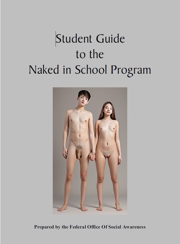 “All right, Kevin. First, the Naked in School Program is a federally mandated cultural education program, completion of which is required, in the schools that run it, for a high school diploma. If you don’t successfully complete your Program participation, you don’t graduate. Everyone in school is required to spend one week naked whenever they are at school or at any school-sponsored activity. Second, a vital component of the Program is for the student to become comfortable with his or her body’s sexuality and to do that, there are various activities that students perform to accomplish that goal. I think the best way of describing that part is to refer to the Program booklet.”