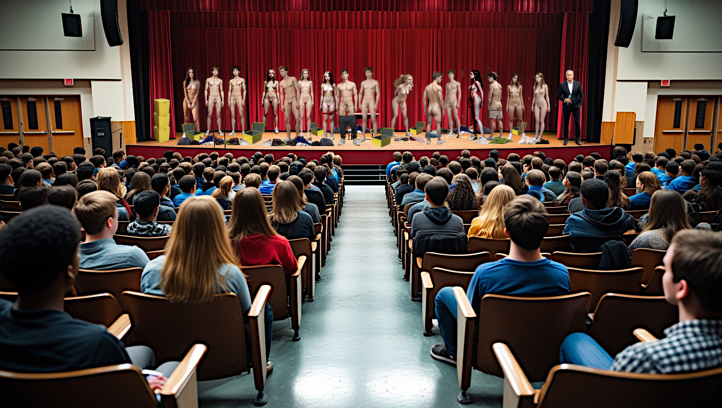 “You’ve all probably read in the tabloids about the Department for Education’s new Naked in School Program, being run in the schools by the Education Authority,” Taylor continued. “And letters about the Program went out to your parents last spring, so you knew the school would need to be planning for it to begin at some point, isn’t that so. Well, we’ve decided to move things right along, not delay any further, and so we’ll begin the Program this term—right here in this hall today.”